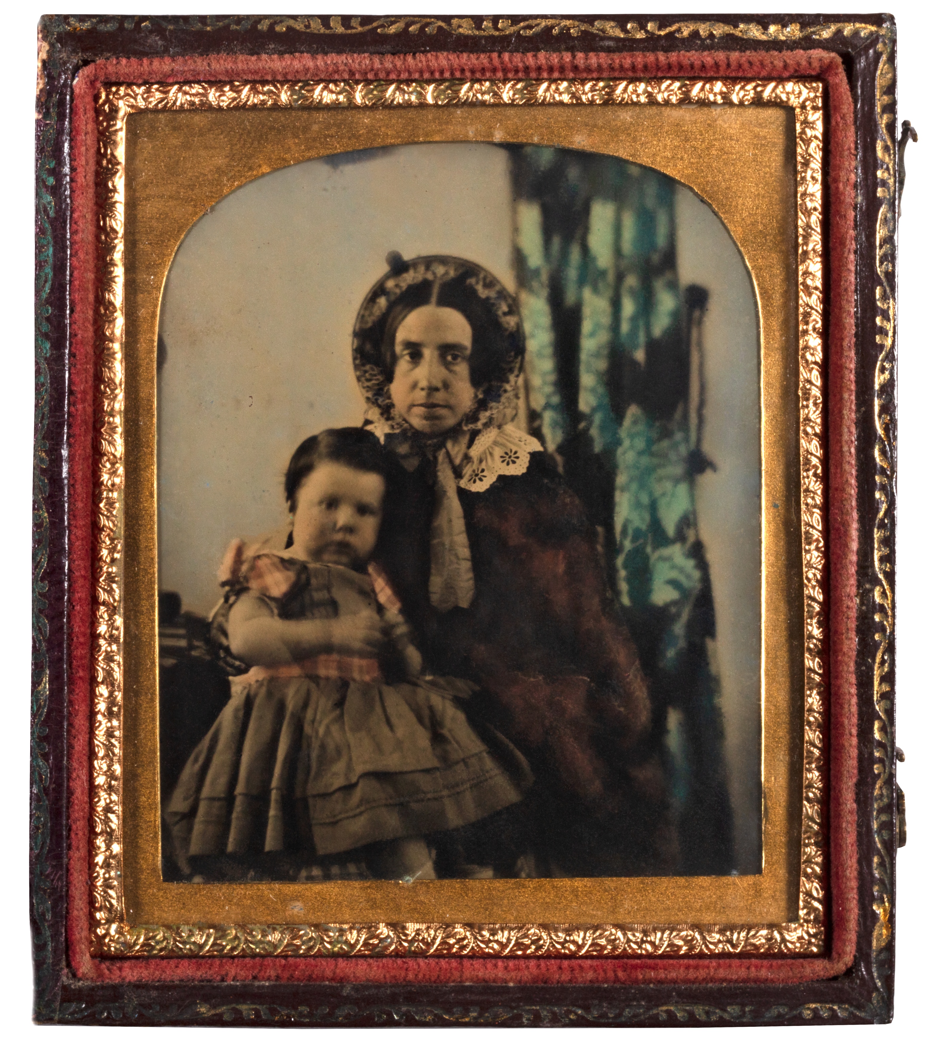Handkolorierte Ambrotypie einer Frau und eines Mädchens im Etui, aufgenommen um 1860.