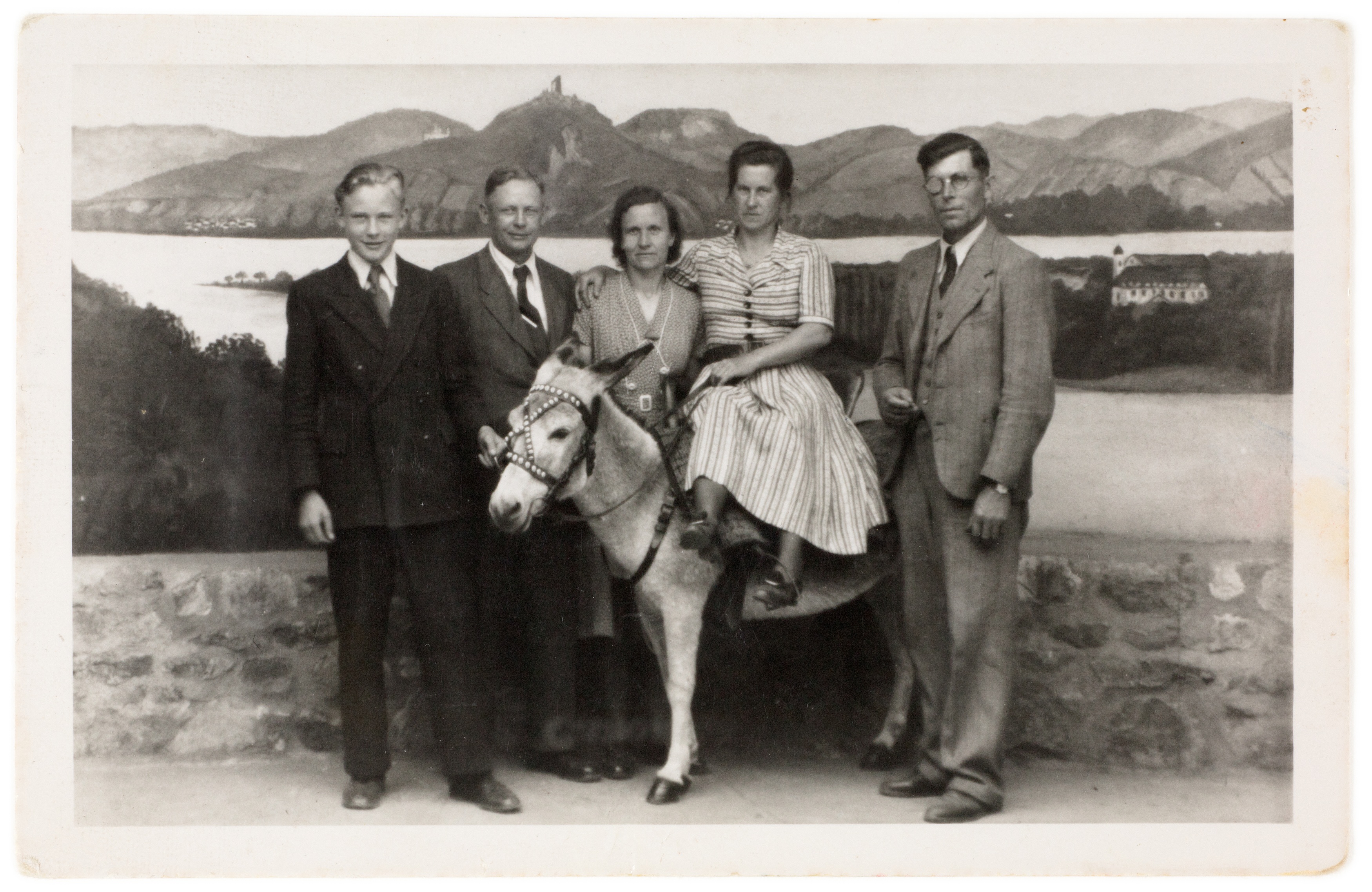 Touristen posieren am Drachenfels mit einem Esel für ein Souvenirfoto im Postkartenformat.