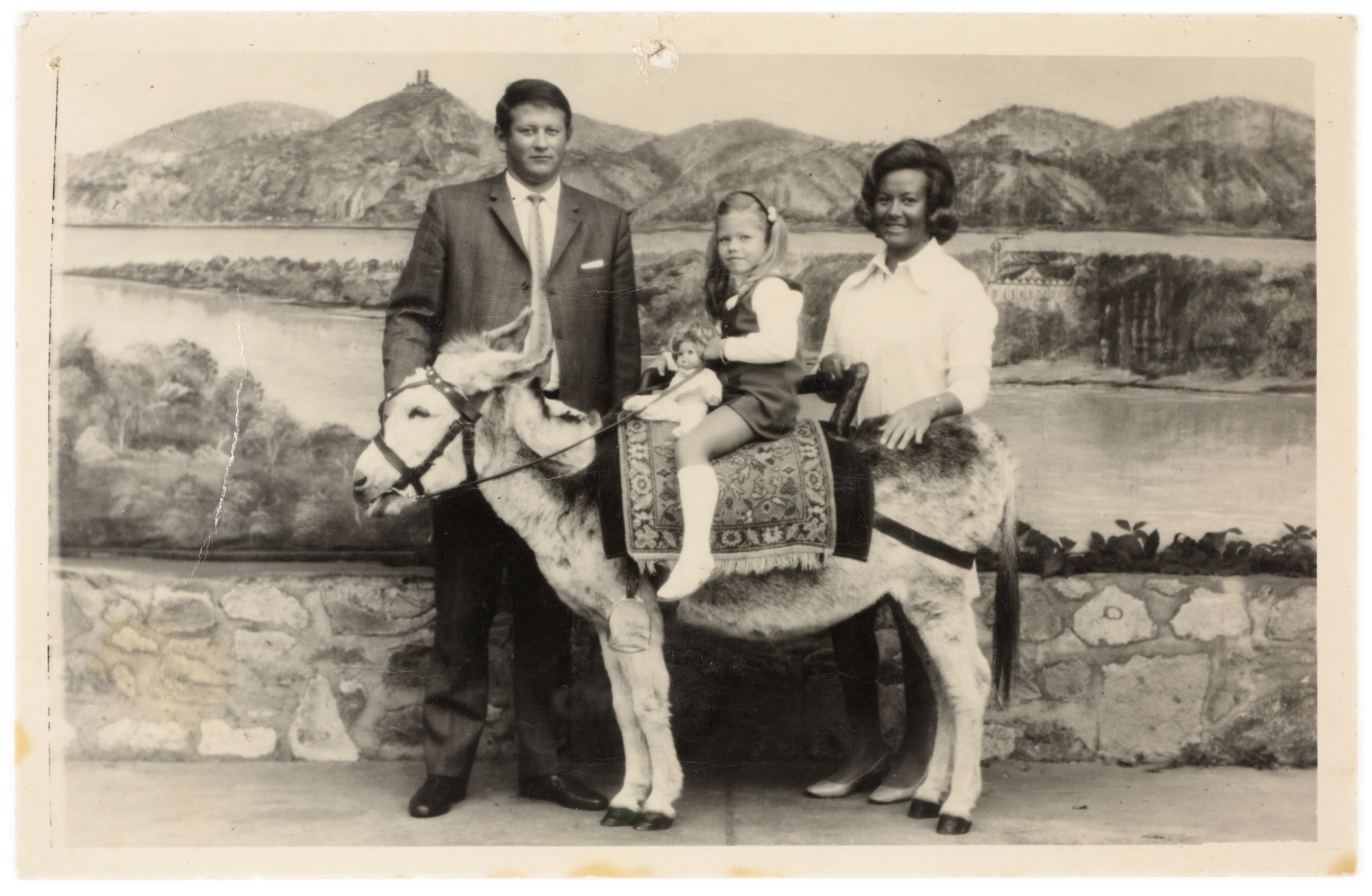 Touristen posieren am Drachenfels mit einem Esel für ein Souvenirfoto im Postkartenformat.