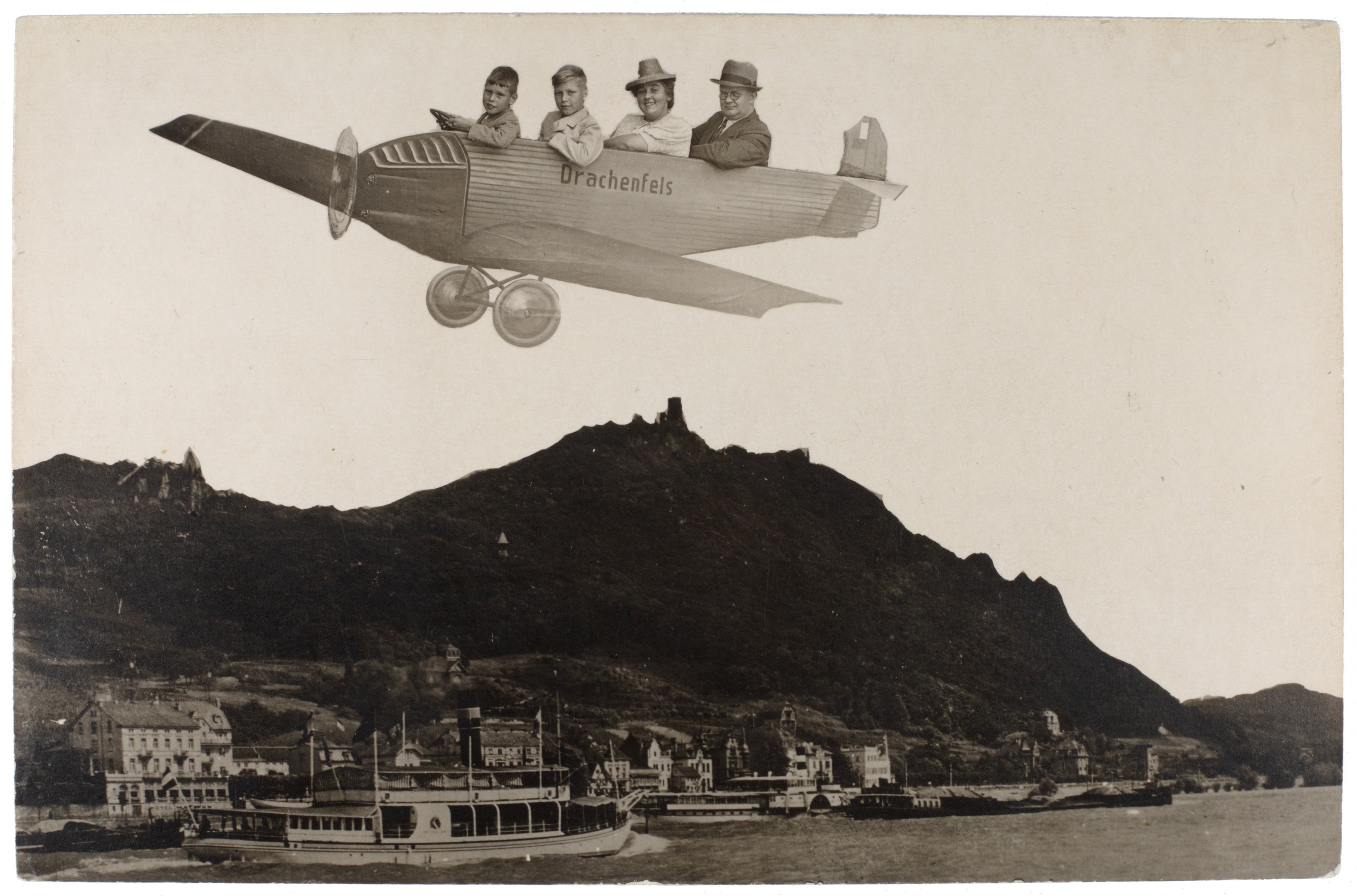 Zwischen den späten 1800er Jahren und den 1970er Jahren wurde den Besuchern des Drachenfels bei Königswinter Schnellfotografie als Souvenir ihrer Ausflüge angeboten. Fotografen präsentierten vor gemalten Kulissen und mit Requisiten inszenierte Bilder, die von humorvollen Szenen mit einem Esel bis zu inszenierten Rundflügen mit Flugzeugmotiven reichten. Diese Fotos dienten als persönliche Erinnerungen und spiegeln die Entwicklung des Tourismus und der Freizeitkultur am Mittelrhein über fast ein Jahrhundert wider.