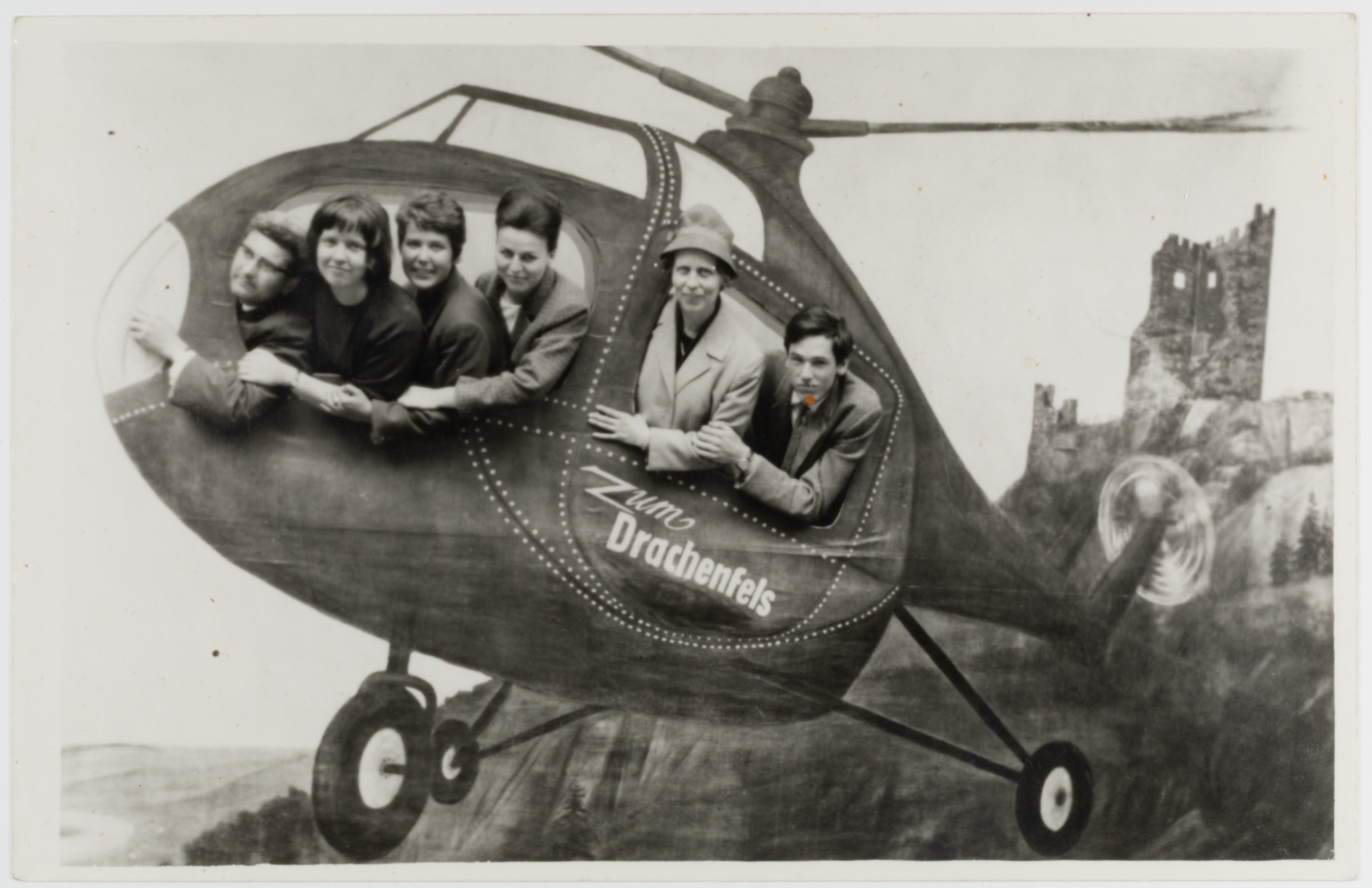 Zwischen den späten 1800er Jahren und den 1970er Jahren wurde den Besuchern des Drachenfels bei Königswinter Schnellfotografie als Souvenir ihrer Ausflüge angeboten. Fotografen präsentierten vor gemalten Kulissen und mit Requisiten inszenierte Bilder, die von humorvollen Szenen mit einem Esel bis zu inszenierten Rundflügen mit Flugzeugmotiven reichten. Diese Fotos dienten als persönliche Erinnerungen und spiegeln die Entwicklung des Tourismus und der Freizeitkultur am Mittelrhein über fast ein Jahrhundert wider.