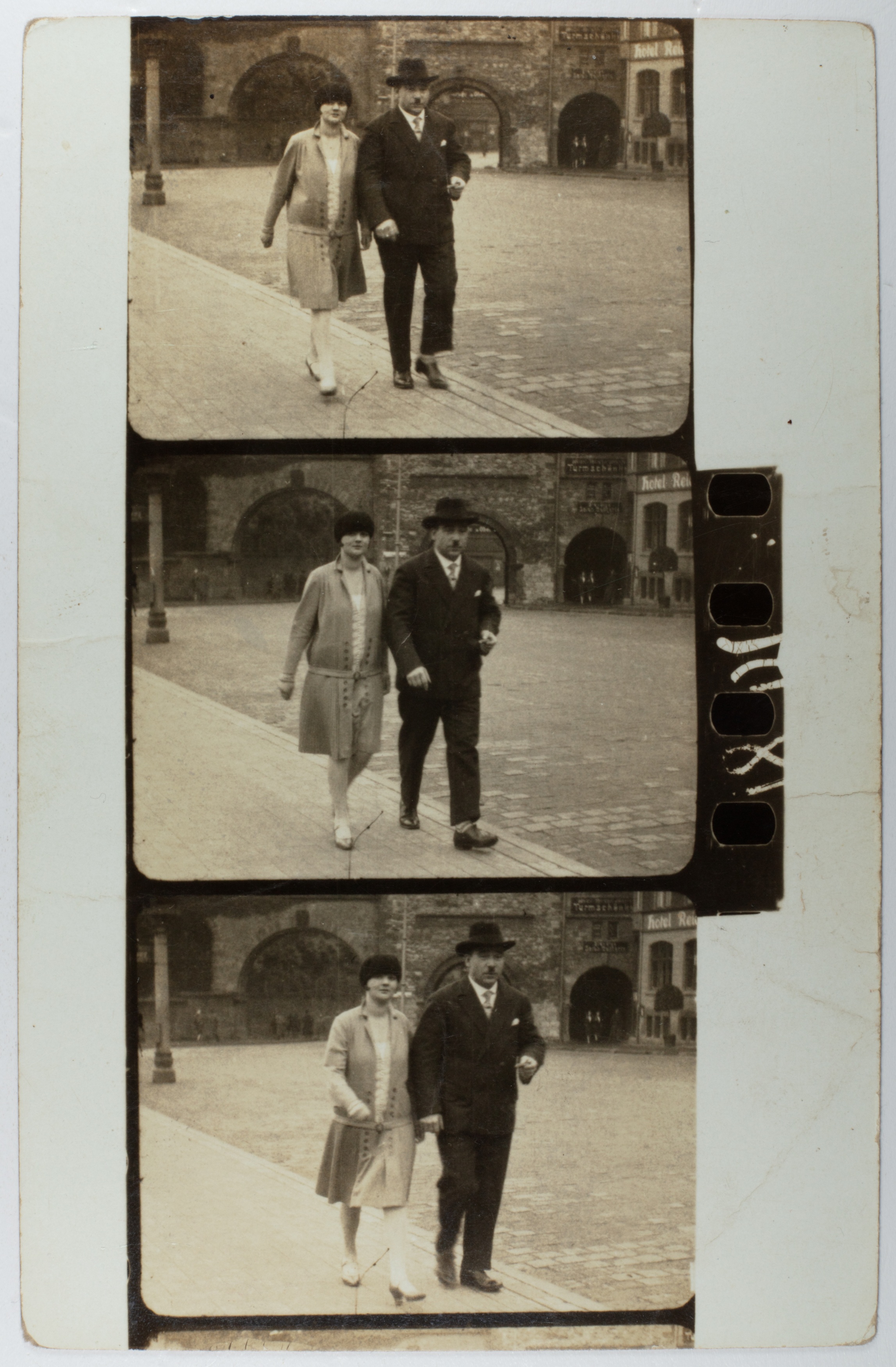 ein kommerzielles Straßenfotografie-Konzept der 1920er-Jahre: Passanten wurden ungefragt im Gehen fotografiert und erhielten einen Zettel – für eine Mark konnten sie den Bildstreifen später erwerben. Ziel war es, durch überraschende Momentaufnahmen spontane Käufer zu gewinnen.