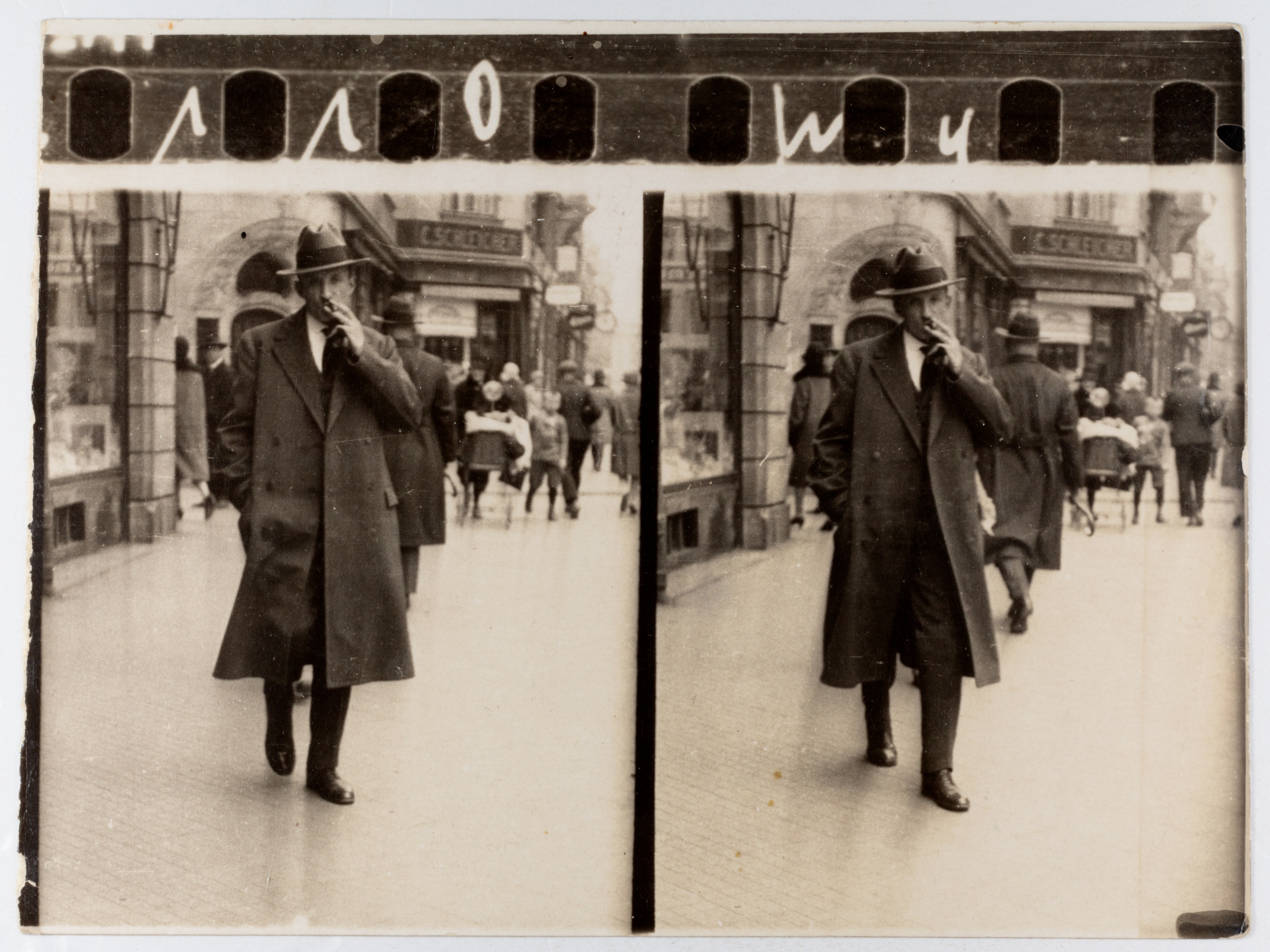 ein kommerzielles Straßenfotografie-Konzept der 1920er-Jahre: Passanten wurden ungefragt im Gehen fotografiert und erhielten einen Zettel – für eine Mark konnten sie den Bildstreifen später erwerben. Ziel war es, durch überraschende Momentaufnahmen spontane Käufer zu gewinnen.