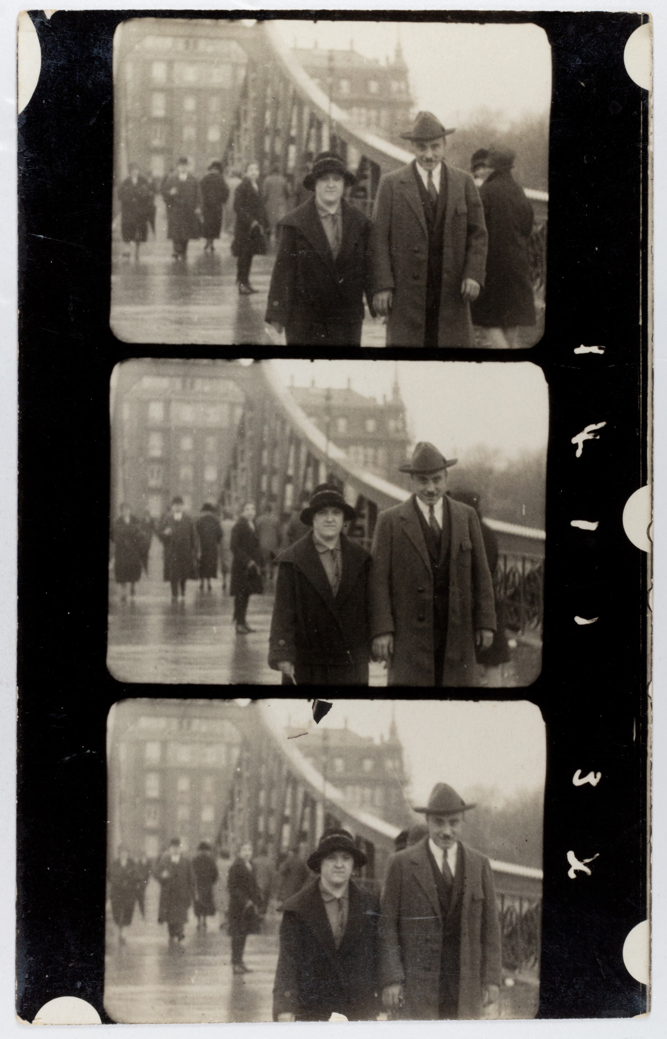 ein kommerzielles Straßenfotografie-Konzept der 1920er-Jahre: Passanten wurden ungefragt im Gehen fotografiert und erhielten einen Zettel – für eine Mark konnten sie den Bildstreifen später erwerben. Ziel war es, durch überraschende Momentaufnahmen spontane Käufer zu gewinnen.