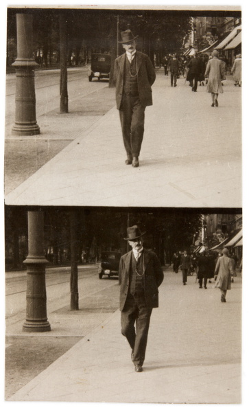 ein kommerzielles Straßenfotografie-Konzept der 1920er-Jahre: Passanten wurden ungefragt im Gehen fotografiert und erhielten einen Zettel – für eine Mark konnten sie den Bildstreifen später erwerben. Ziel war es, durch überraschende Momentaufnahmen spontane Käufer zu gewinnen.