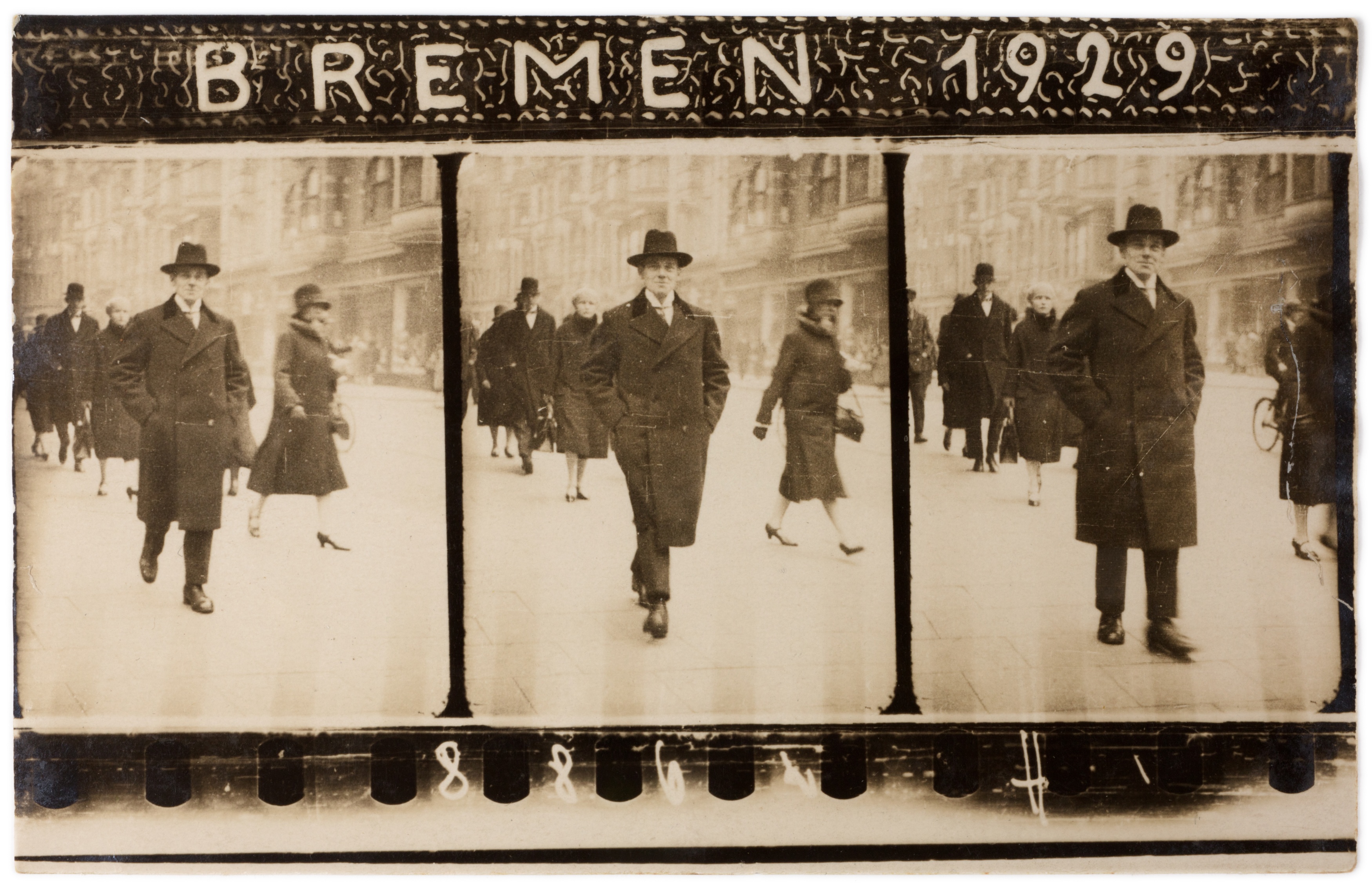 ein kommerzielles Straßenfotografie-Konzept der 1920er-Jahre: Passanten wurden ungefragt im Gehen fotografiert und erhielten einen Zettel – für eine Mark konnten sie den Bildstreifen später erwerben. Ziel war es, durch überraschende Momentaufnahmen spontane Käufer zu gewinnen.