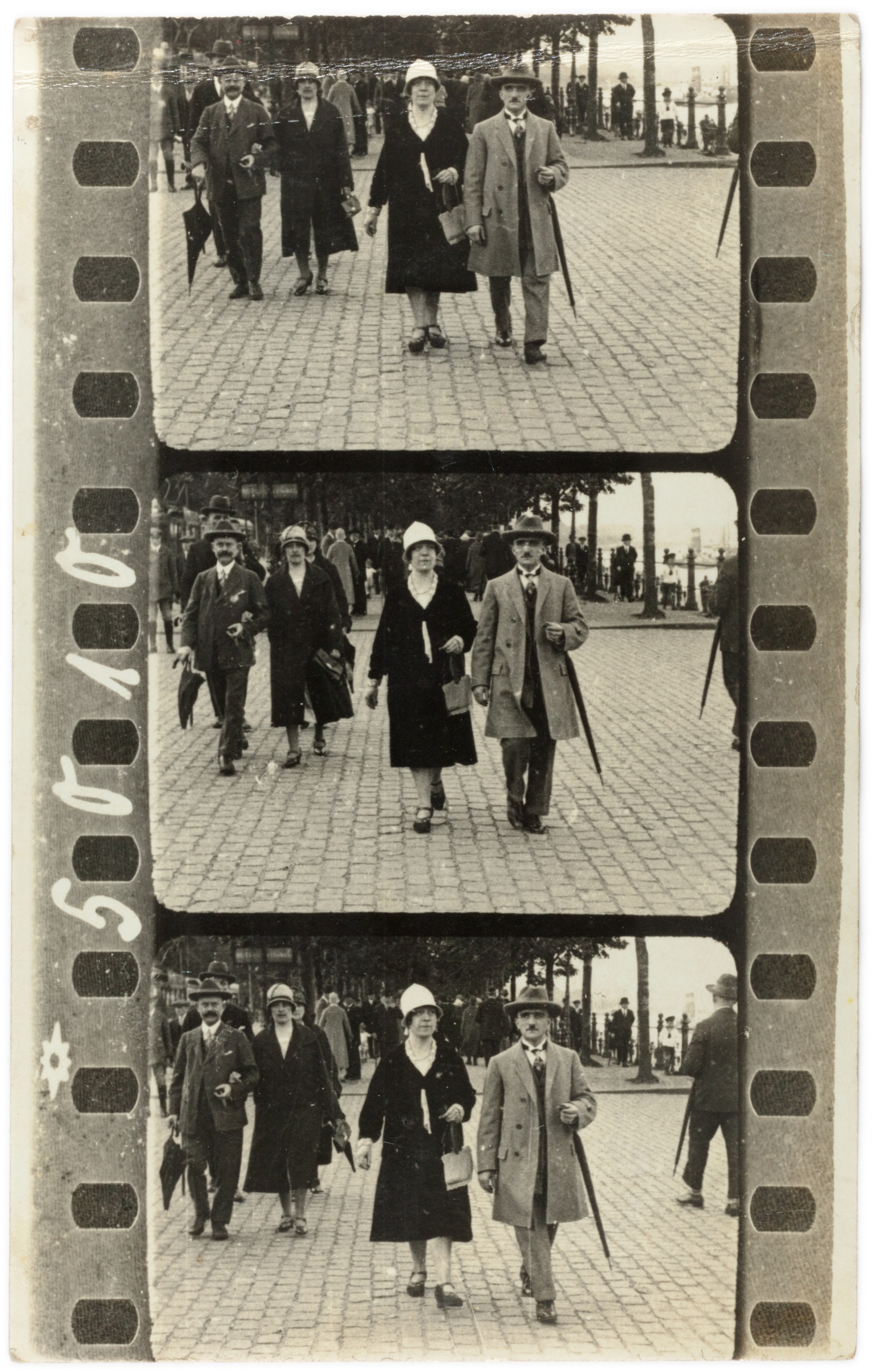 ein kommerzielles Straßenfotografie-Konzept der 1920er-Jahre: Passanten wurden ungefragt im Gehen fotografiert und erhielten einen Zettel – für eine Mark konnten sie den Bildstreifen später erwerben. Ziel war es, durch überraschende Momentaufnahmen spontane Käufer zu gewinnen.