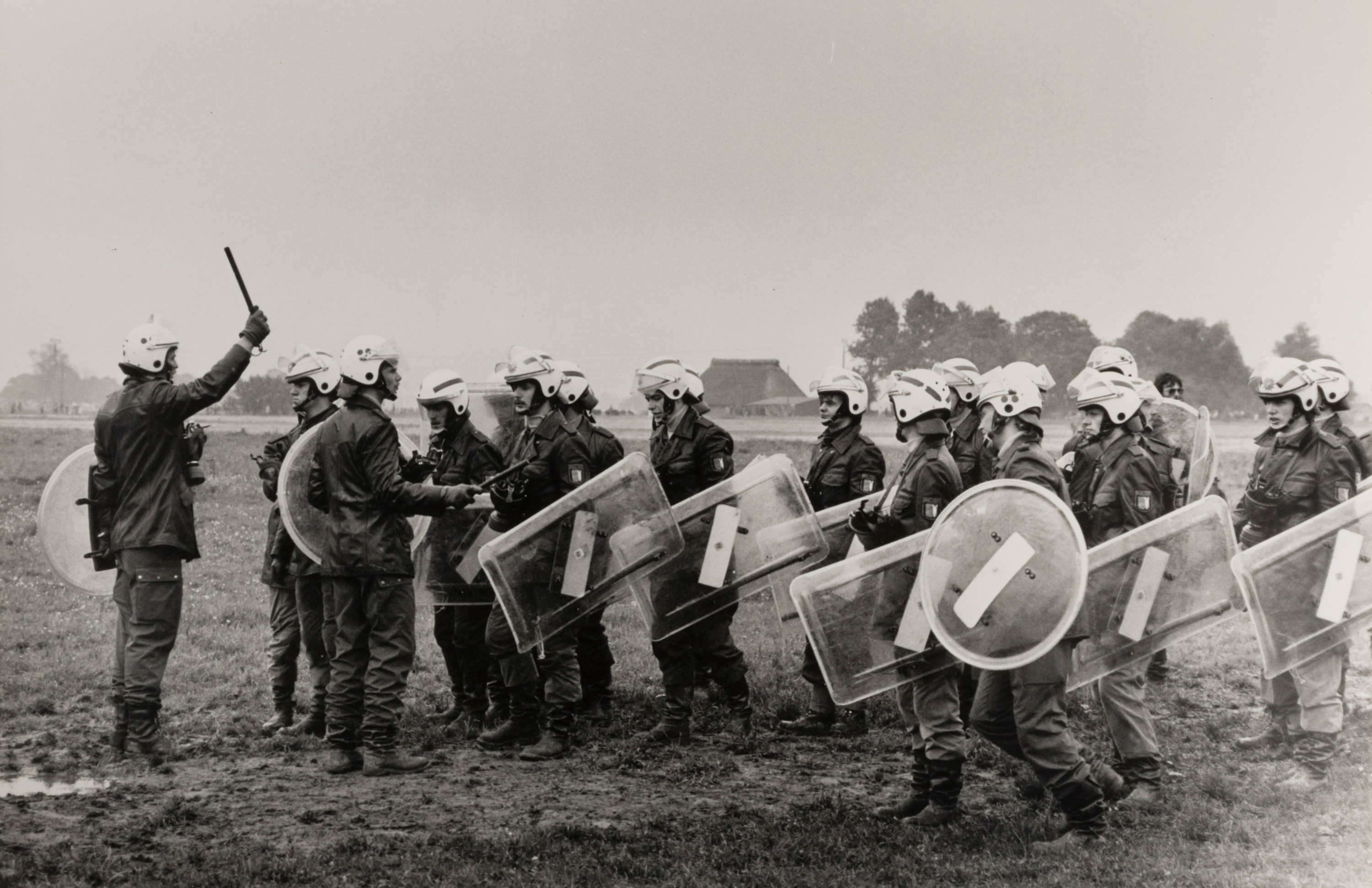 Demonstration in Brokdorf am 7. Juni 1986. Protest gegen den Ausbau des Kernkraftwerks Brokdorf, zahlreiche Aktivisten und Demonstranten versammeln sich vor Ort.