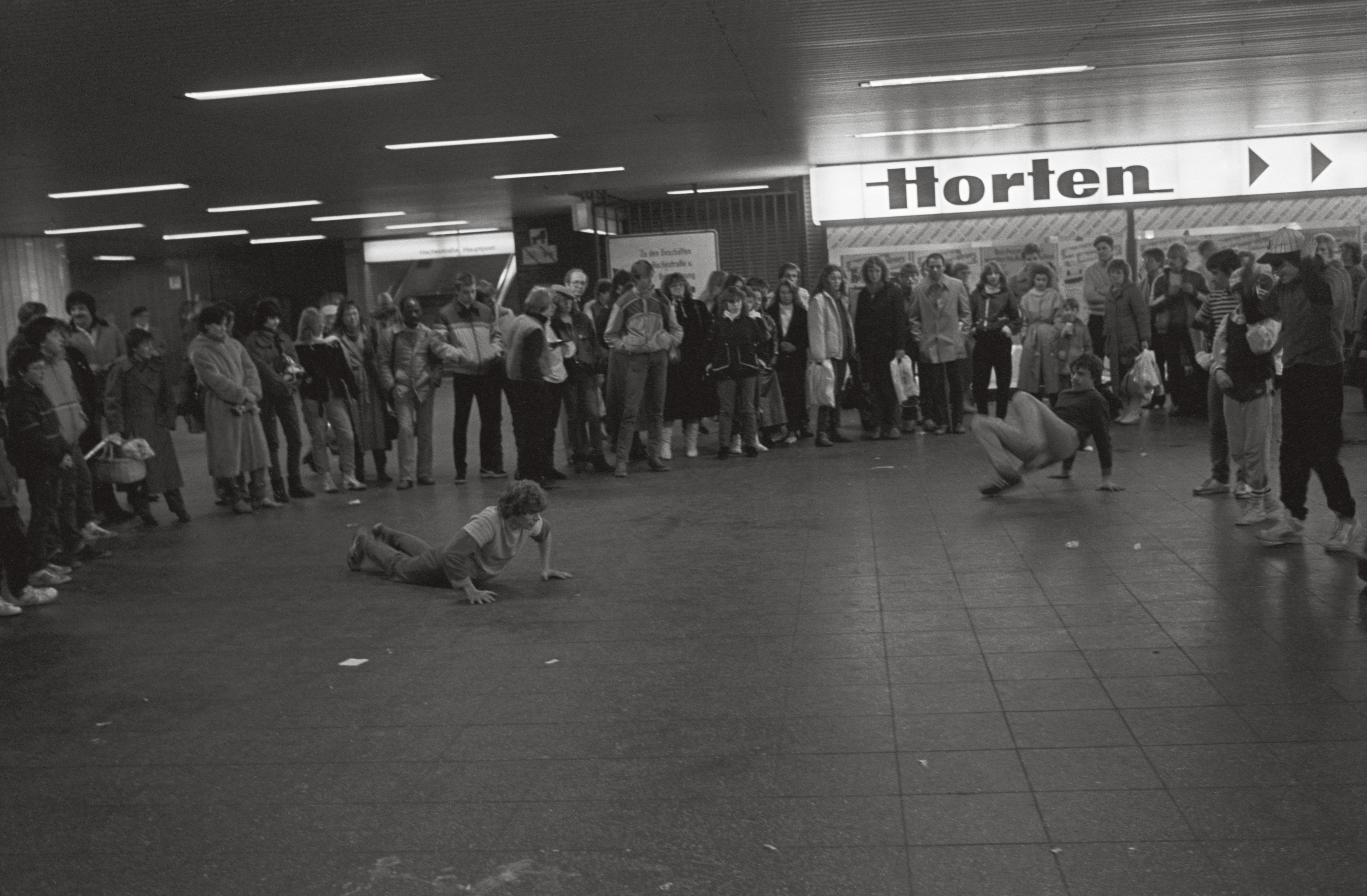 Breakdancer in der Bahnhofsunterfuerung am Hauptbahnhof in Essen 1985