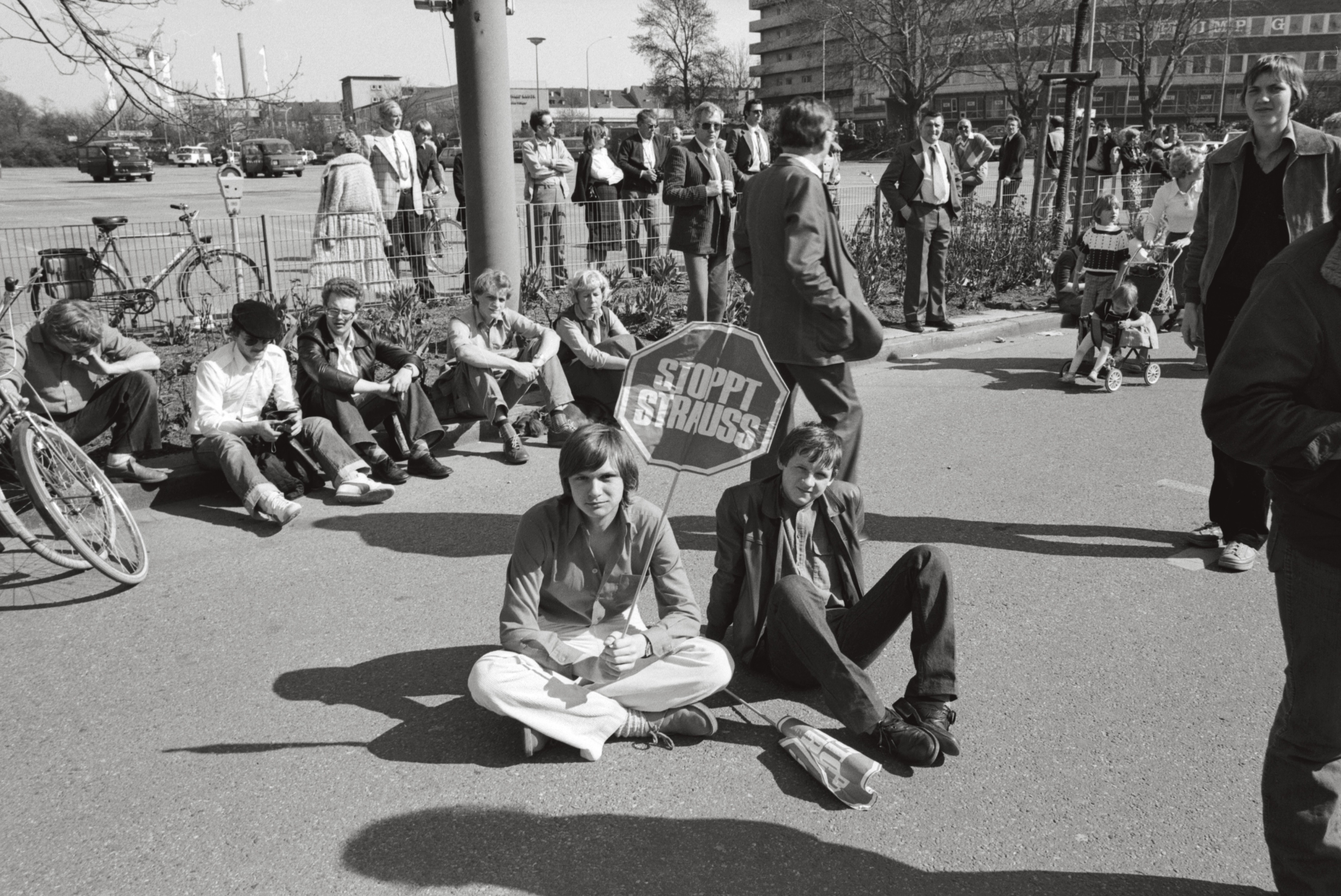 Demonstranten vor der Grugahalle bei einer Wahlkampf Kundgebung von Franz Josef Strauss, Essen-Rüttenscheid 1980