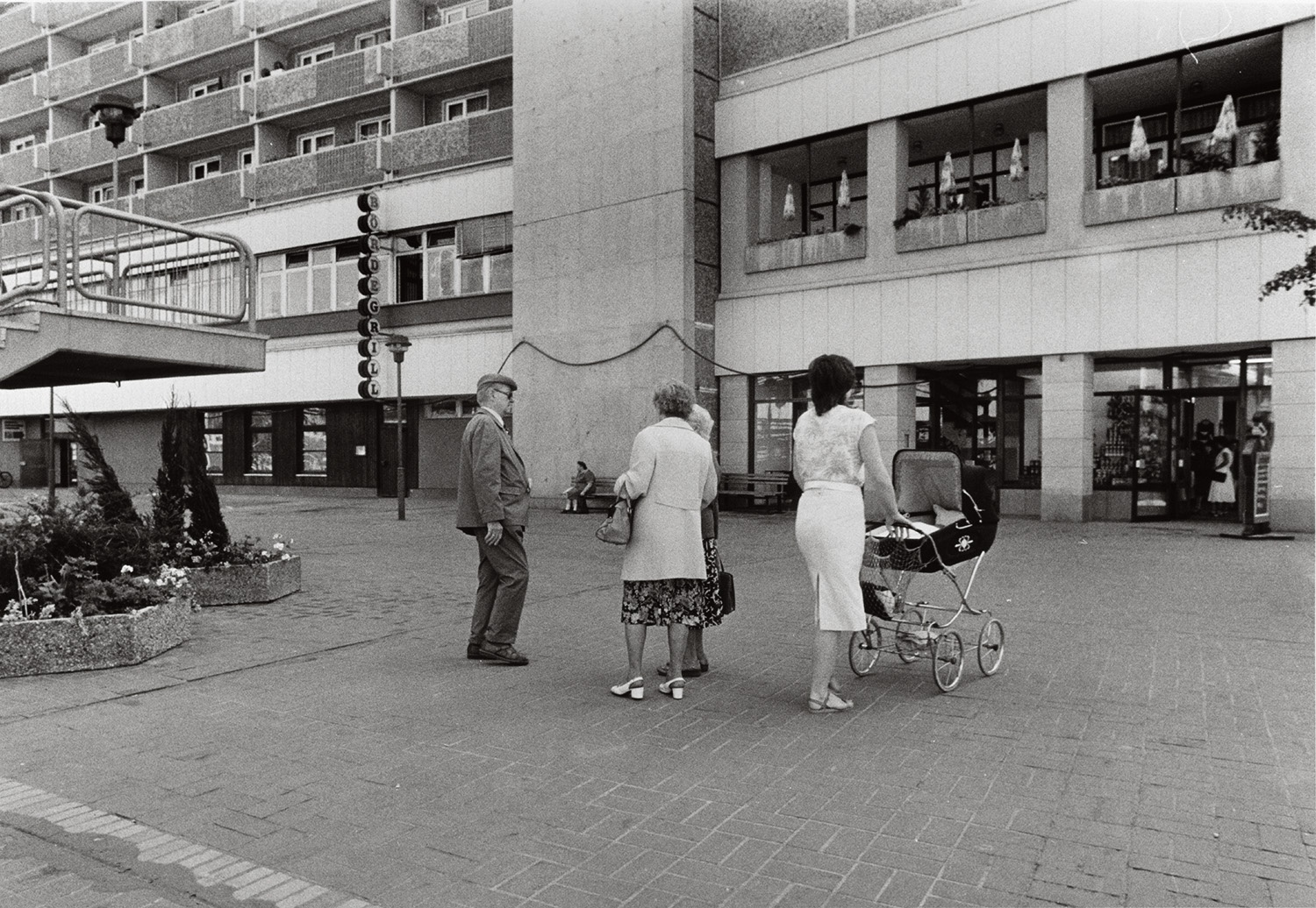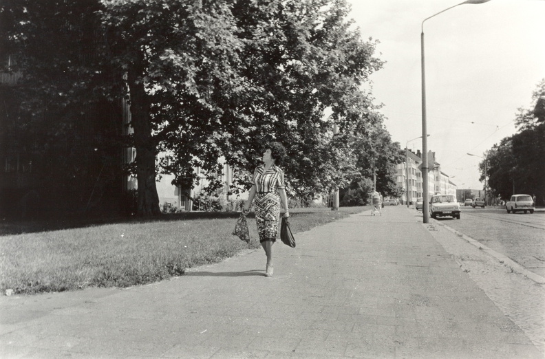 Alltagsszene in der Innenstadt von Magdeburg, DDR, 1987. Passanten auf einer Einkaufsstraße zwischen Plattenbauten und typischen Elementen sozialistischer Stadtplanung sichtbar.