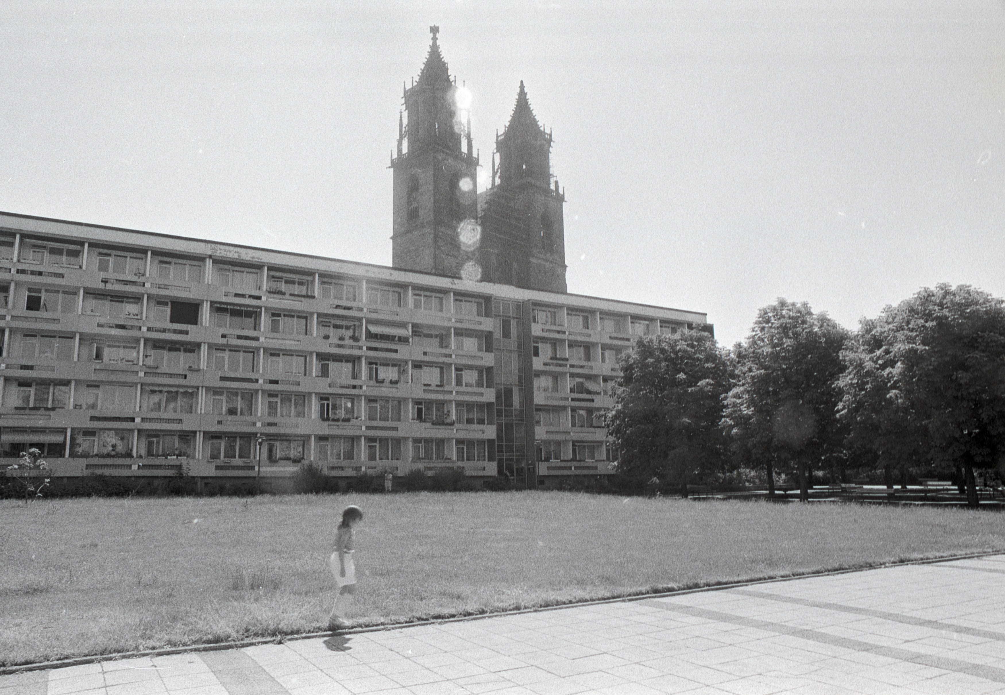 Magdeburg, DDR, 1987, Frauen, Plattenbau, Kirchtürme, Dom, Platz, Bäume, Gehweg, Schwarzweißfoto